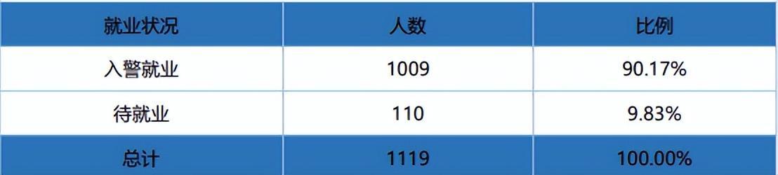 1119名毕业生中,男生949人,占毕业生总人数84.81%;女生170人,占毕业生总人数的15.19%;毕业生分布刑事侦查、治安管理、交通管理、信息网络安全监察、刑事科学技术、警务战术与指挥、特警等七个专业在7个专业,其中人数占比最多专业的是治安管理(27.17%)。经统计,就业率最高的专业为警务战术与指挥专业(95%)。