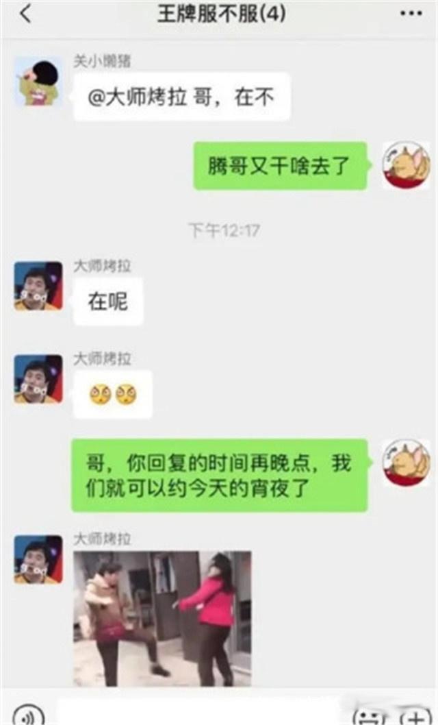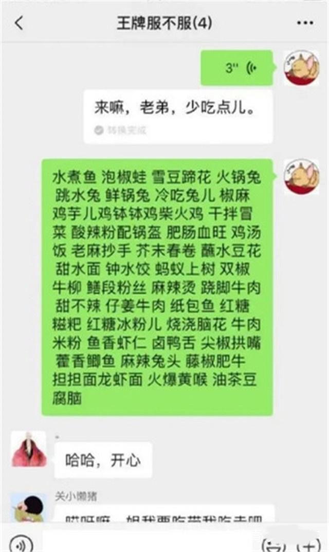 今天爆出一段聊天记录,疑似王牌家族内部的聊天记录,群名叫王牌服不服,里面只有四个人,分别是贾玲、沈腾、华晨宇、关晓彤,聊天内容非常平常,首先是贾玲在群里说:“晚上来点夜宵啊,”关晓彤立刻回复说:“哎呀嘛,我饿了,”华晨宇说:“我在准备演唱会,要减肥,”贾玲发了个语音,又说:“来嘛,老弟,少吃点儿,”接着就开始报菜名了,水煮鱼、泡椒蛙、雪豆蹄花、火锅兔、跳水兔、鲜锅兔、冷吃兔儿等等,大概有几十个菜名,华晨宇说:“哈哈开心,”网友看到这儿说:“傻孩子,看个菜名就这么开心啦!