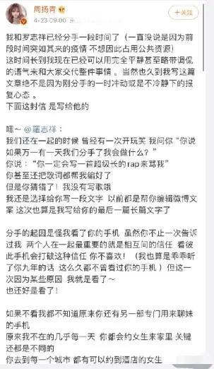 文案最后周扬青还撕破脸皮,痛骂罗志祥是渣男,两人9年的感情因为男方出轨结束了。