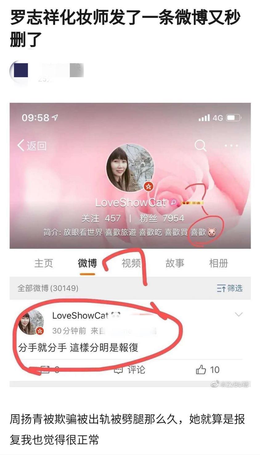 实际上在在两人分手消息公布后不到一个小时,罗志祥化妆师也针对分手事件发了一条微博又秒删,其内容是:"分手就分手,这分明是报复。"