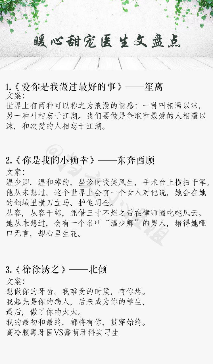 笙离的《爱你,是我做过最好的事》这是我最喜欢的一本医生文,温柔中医男主VS酒店白领女主。男女主都是在分手之后遇见彼此的,在孤独的他乡相互温暖。他们的爱情让人暖心,文中穿插的中药更有滋味。每当看到温润的何苏叶,都让我有种内心很宁静的感觉。作者写得很好,也让我感受到了我们中医的魅力。一篇很温暖的文,全文无狗血,就是两个平凡人相识,互相温暖,互相治愈的文,喜欢男女主细水长流的爱情,在这篇文里你可以找到一种平凡的温暖,喜欢这种爱情的宝宝可食用。