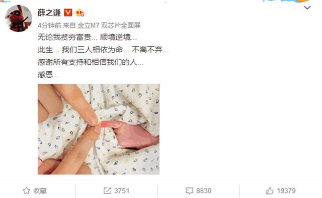 9月6日,薛之谦在微博宣布孩子出生,他还写道:“无论我贫穷富贵,顺境逆境,此生我们三人相依为命,不离不弃,感谢所有支持和相信我们的人,感恩。”薛之谦还是一如既往的希望用点点点符号。