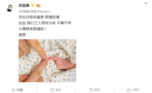 高磊鑫也发文宣布宝宝出生,小名叫“小雪糕”。