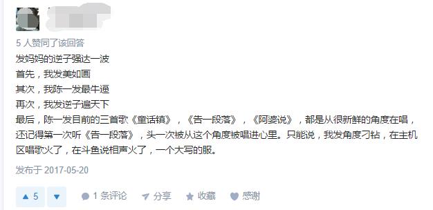 有人说出自己自己的故事,也有人提到陈一发目前的三首歌《童话镇》,《告一段落》,《阿婆说》,都是从很新鲜的角度在唱,还记得第一次听《告一段落》,头一次被从这个角度被唱进心里。只能说,我发角度刁钻,在主机区唱歌火了,在斗鱼说相声火了,一个大写的服。