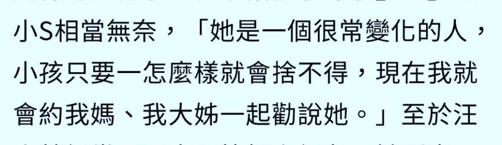 小S吐槽,大S只要看到孩子怎样怎样,她就会产生不舍,根本舍不得出门,现在要出动妈妈及大姐一起上门劝她,十分夸张。