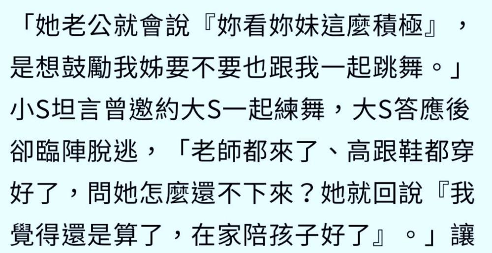 当时,小S跟大S约好一起练习舞蹈,还特别请了老师来到大S家里,没想到她竟在最后关头说“我觉得还是算了”。