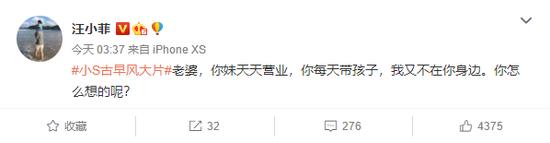 而她的姐姐大S则鲜少出面营业,以至于大S老公汪小菲都发文喊话称:“老婆,你妹天天营业,你每天带孩子,我又不在你身边。你怎么想的呢?”