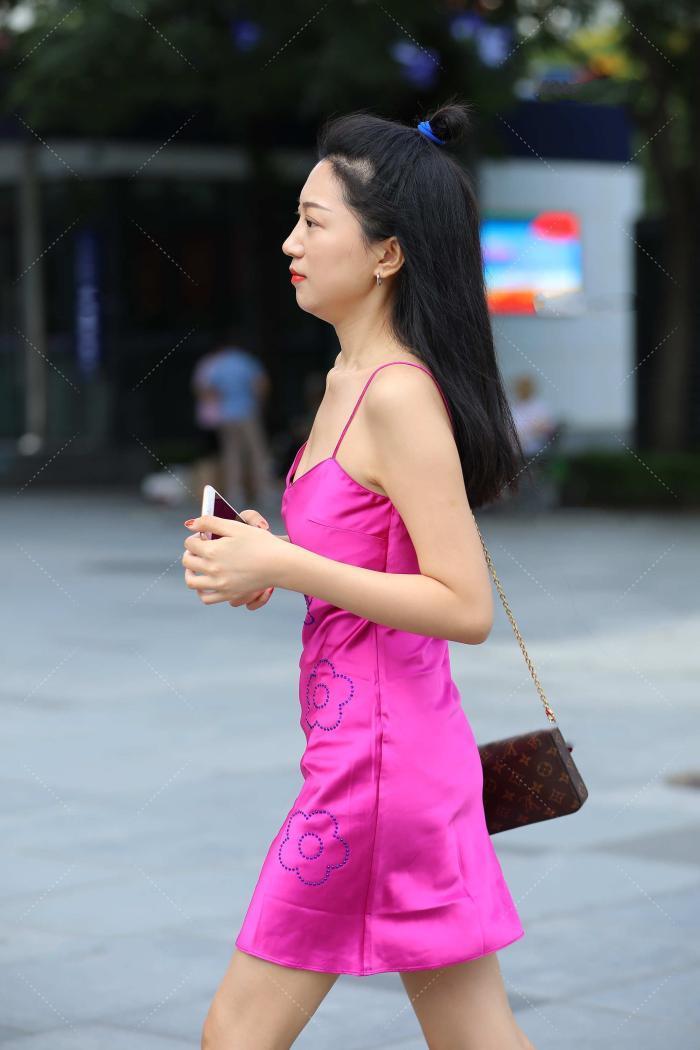 玫粉色连衣裙,配合吊带V领设计,不浮夸浪漫还高级