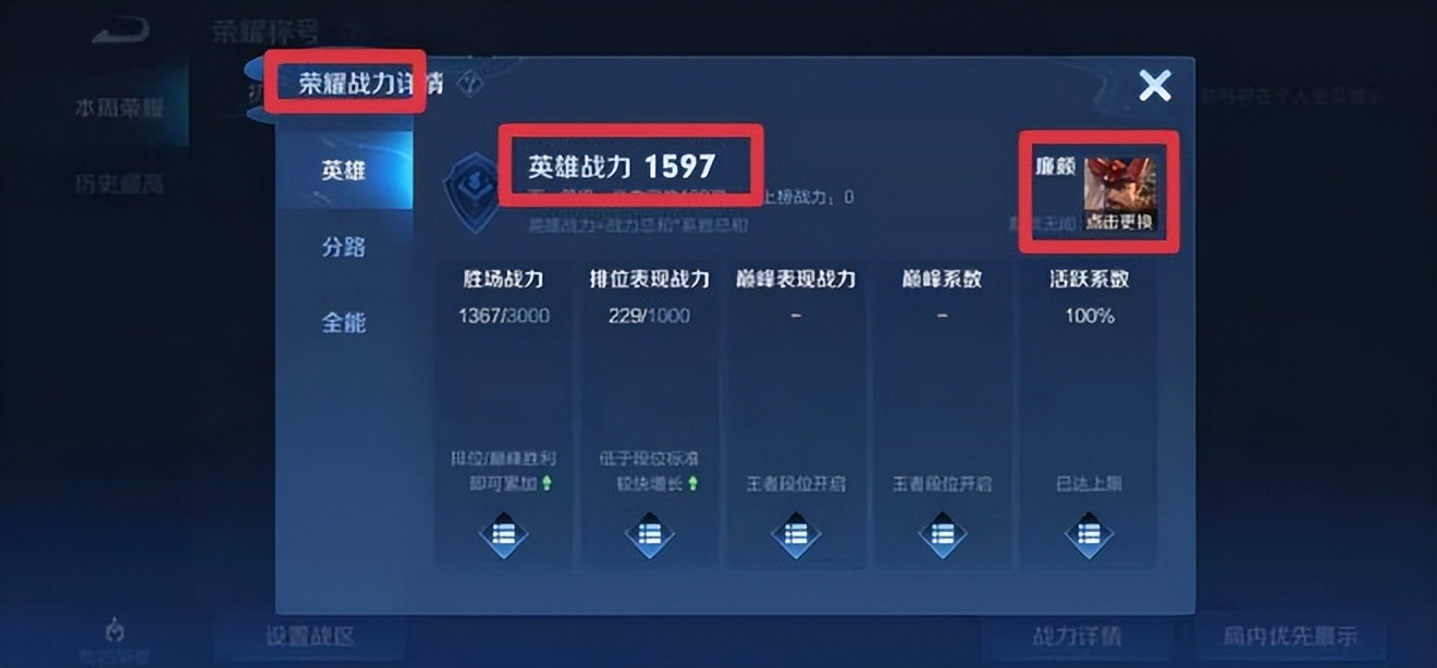 英雄战力查看位置,进入荣耀称号页面,点击右下角的战力详情按键,就可以进入荣耀战力页面,可以通过更换不同的英雄查看他们的英雄战力。