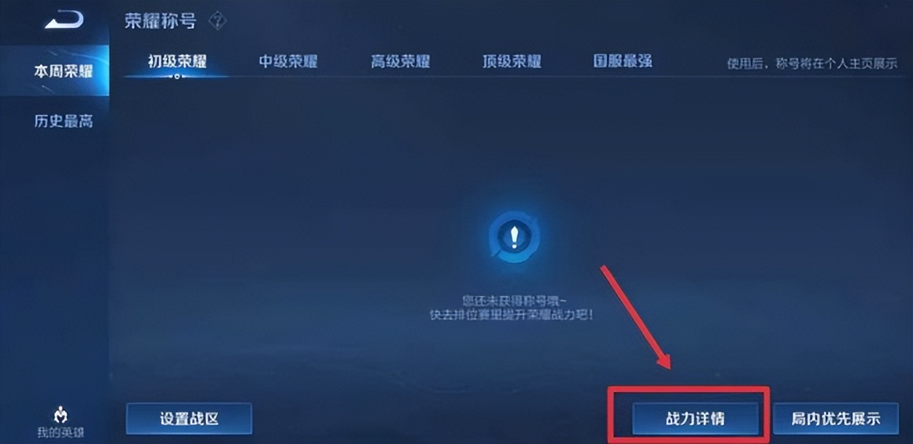 进入荣耀称号页面,点击右下角的战力详情按键;