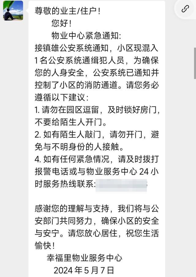 5 月 7 日,网传信息显示,云南省昭通市镇雄县康养小镇幸福里物业向业主、住户发布紧急通知称,小区混入 1 名警方通缉人员,警方已通知并控制了小区的消防通道。物业提醒业主、住户 " 请勿在园区逗留,及时锁好房门,不要给陌生人开门 "" 如有陌生人敲门,请勿开门,避免与不明身份的人接触 "。
