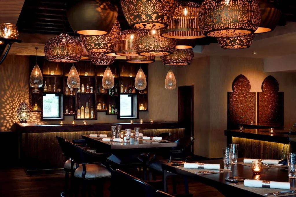 大堂里摇曳着烛光,映衬着阿拉伯特有的装饰,穹窿、开孔、纹样 这些伊斯兰建筑的特点,都融入度假村大堂精妙的设计中。