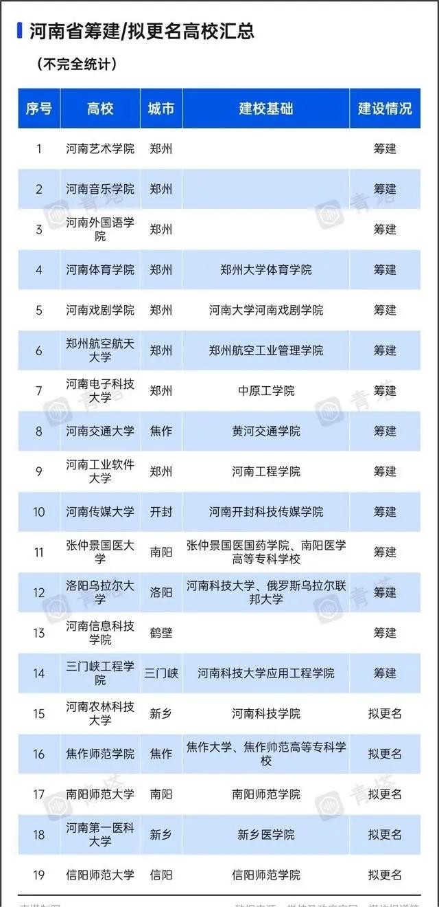据不完全统计,河南省在2023年共有19所高校筹建或拟更名,其中有焦作大学与焦作师范高等师范专科学校拟联合升级为本科院校,并拟更名为焦作师范学院;