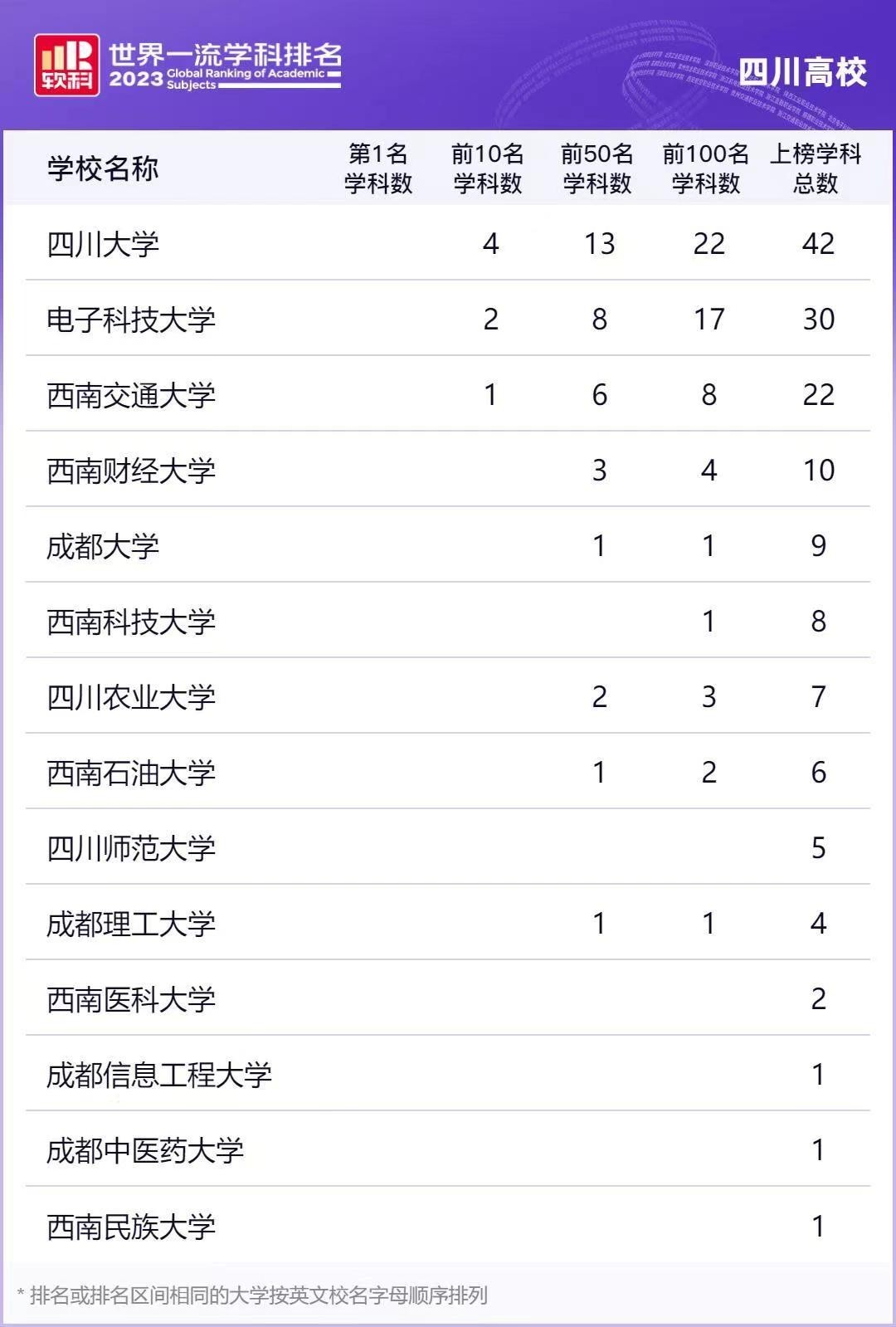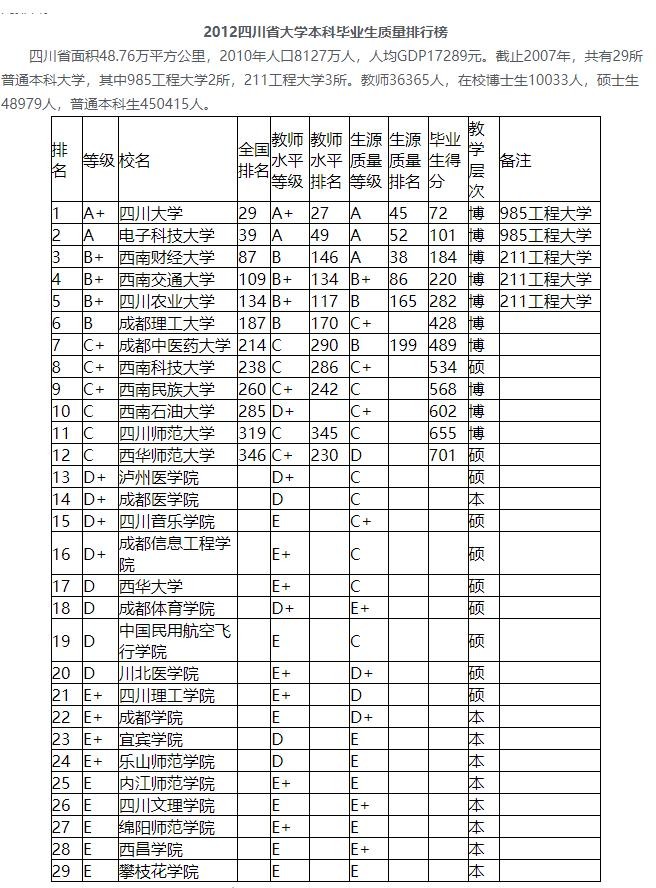 四川大学、电子科技大学、西南交通大学、西南财经大学、西南科技大学、四川农业大学、西南石油大学、成都理工大学、四川师范大学、成都大学;