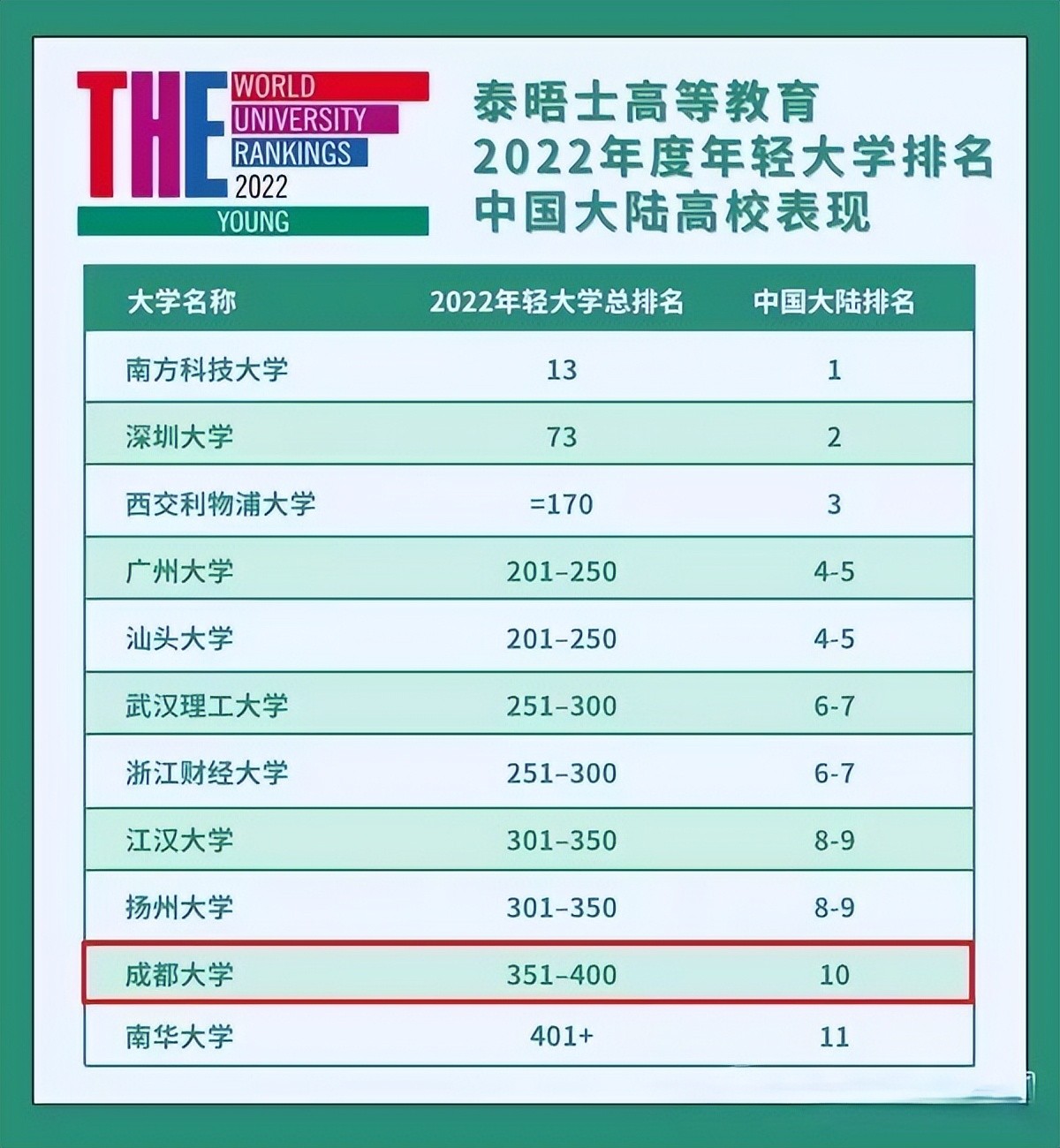 在2022年泰晤士中国大陆年轻大学排名榜上,成都大学排名全国年轻大学第10名;