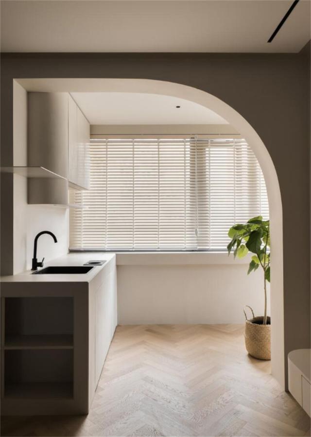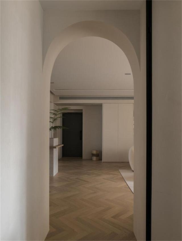 垭口不装门套,直接做拱形门,利用圆拱造型弱化突兀感,好看又富有质感,瞬间让居室内的格调上涨一倍。