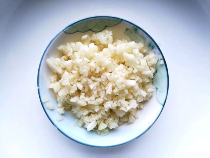 4.准备两头大蒜,将大蒜去皮之后剁成蒜蓉,大家不想剁的话,也可以用打蒜器打,不过个人还喜欢用刀剁,并且这个蒜才是香酥大虾的灵魂。