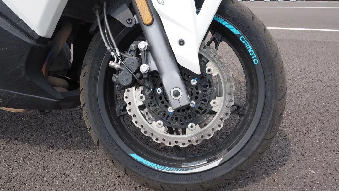 轮圈参数为前轮120/70R17、后轮160/60R17,原厂配备的象牌轮胎,测试当天更换CST S1运动休旅专用半热熔轮胎,无论支撑性、转向抓地力、倾倒速度、制动力都优于原厂配胎。