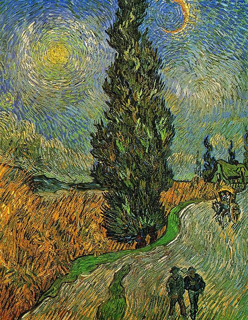 为了能更充分地表现内在的情感,梵高探索出一种所谓表现主义的绘画语言。他认为:“颜色不是要达到局部的真实,而是要启示某种激情。”在他画中,浓重响亮的色彩对比往往达到极限。而他那富于激情的旋转、跃动的笔触,则使他的麦田、柏树、星空等,有如火焰般升腾、颤动,震撼观者的心灵。在他的画作上,强烈的情感完全溶化在色彩与笔触的交响之中。文森特·威廉·梵高(Vincent Willem van Gogh,1853.3.30-1890.7.29),是荷兰后印象派画家,他是表现主义的先驱,并深深影响了二十世纪艺术,尤其是野兽派与表现主义。他早期画风写实,受到荷兰传统绘画及法国写实主义画派的影响。梵高的作品,如《星夜》、《向日葵》与《有乌鸦的麦田》等,现已跻身于全球最著名、广为人知与珍贵的艺术作品的行列。