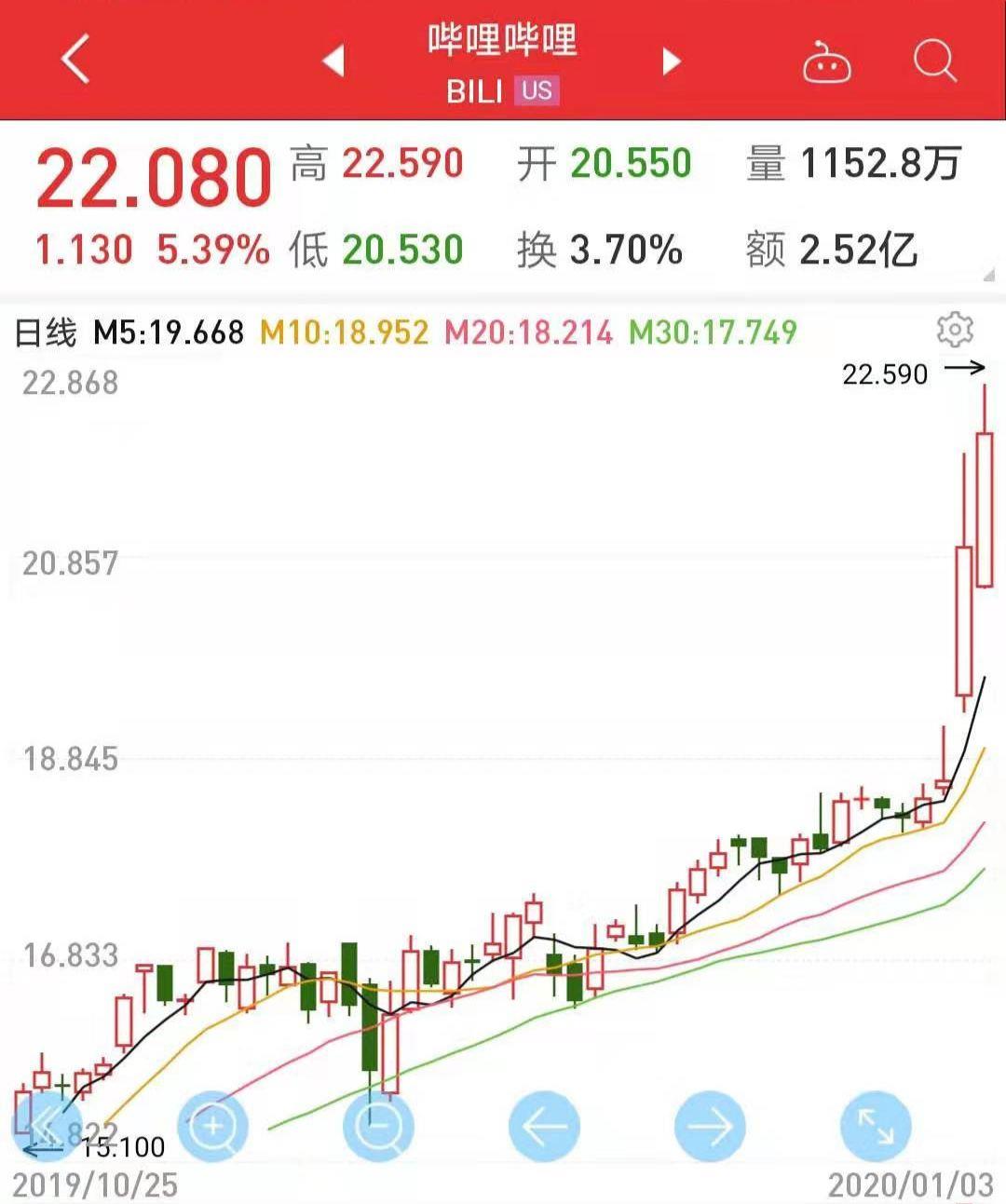 近期B站的跨年晚会因其独特的创意席卷各大视频网站,给公司带来了极大的正面影响,股价也同时大涨,想必大家都在后悔没有早点买B站的股票: