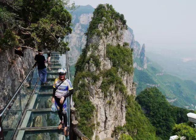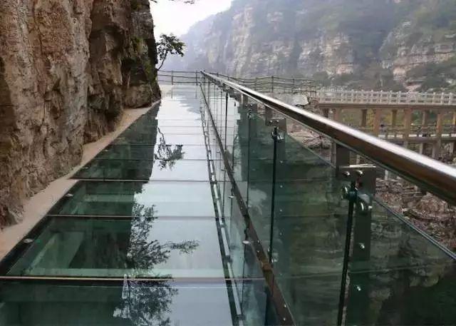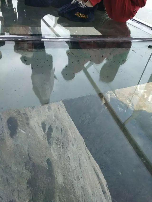 这条玻璃栈道全部用透明玻璃铺设,站在栈道上一低头就能看到垂直的山体。