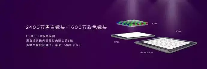 前置2400万(彩色)+200万(专业虚化镜头)像素,F/2.0光圈,支持固定焦距;