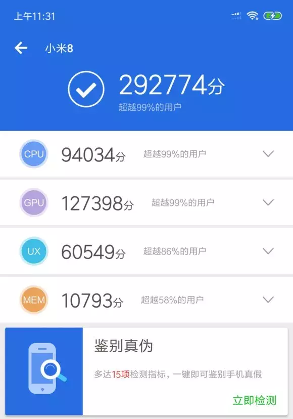发布会时说小米8安兔兔跑分为30万+,但实际上我们使用的时候为29万+,甚至还有人跑得27万+。