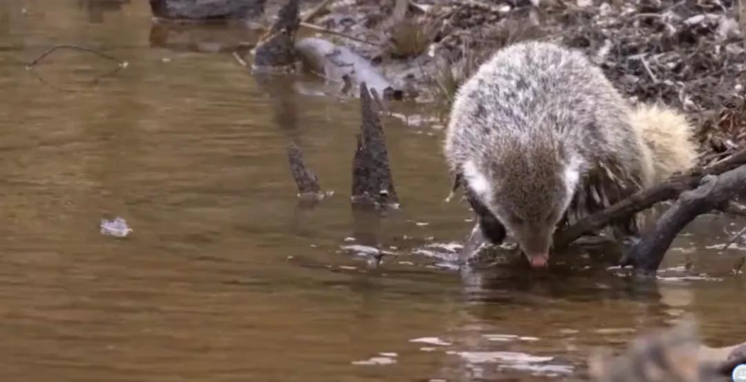 野猪的出现,并未影响食蟹獴一家到水下“捞食”的兴致,它们到达小溪边后,先畅饮一番山泉水,而后到浅水处,用前爪探进水中摸索着,突如其来的惊扰,让藏在水中的小动物们无所循形。