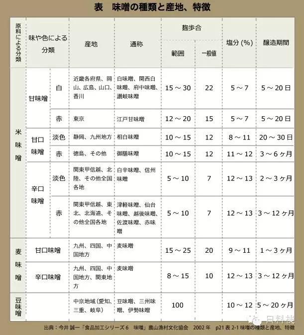 豆味噌的“麹歩合100”疑似有误,一般称“全量麹”日本不同地区会有不同的甘辛度偏好,关东地区及气候较寒冷的地方,如北海道、东北地区,料理偏重口味,制作的味噌也以辛口为主;而关西等地区料理偏清淡,味噌也以甘口居多。麹