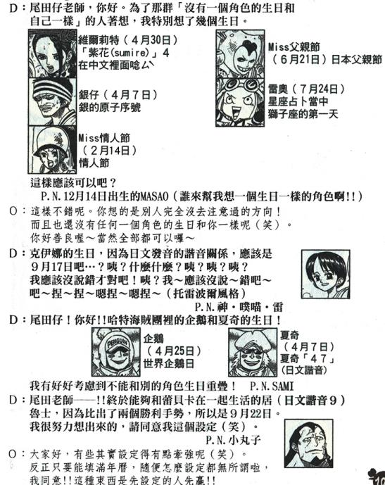 接下来是尾田照例根据读者意愿定了一大波角色的生日,其中那个善良的读者的生日和我一样呢,至今还是空缺的一天呢。