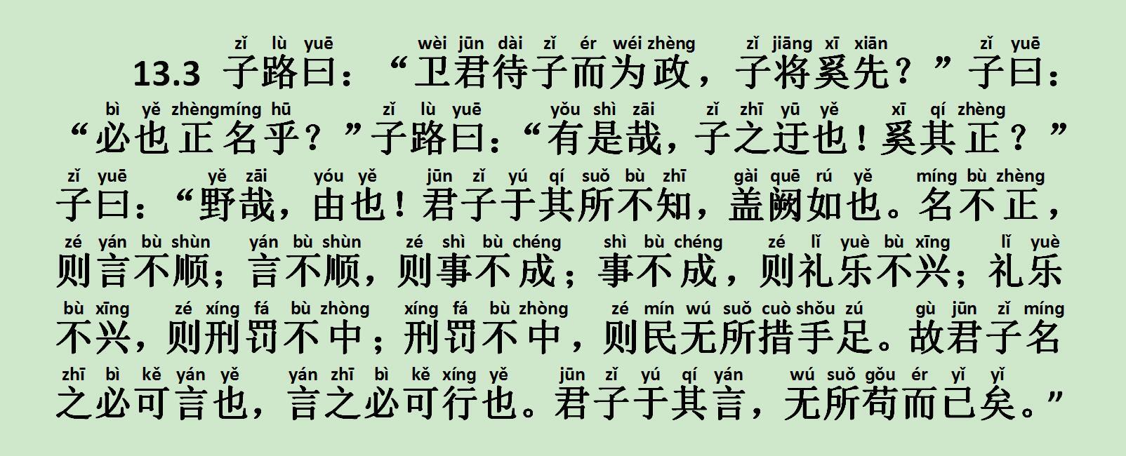 13.3 子路曰:“卫君待子而为政,子将奚先?”子曰:“必也正名乎!”子路曰:“有是哉,子之迂也!奚其正?”子曰:“野哉,由也!君子于其所不知,盖阙如也。名不正,则言不顺;言不顺,则事不成;事不成,则礼乐不兴;礼乐不兴,则刑罚不中;刑罚不中,则民无所措手足。故君子名之必可言也,言之必可行也。君子于其言,无所苟而已矣。”