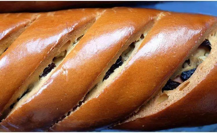 出炉之后的大列巴,浑身上下散发着蛋奶香,变成了诱人的金黄色。此前的切口因为高温烘焙而裂开更大,显出内里饱满的果干,让人充满食欲。它是出自维吾尔族人的清真食品,因为是当日做,当日发,没有添加剂和膨松剂。