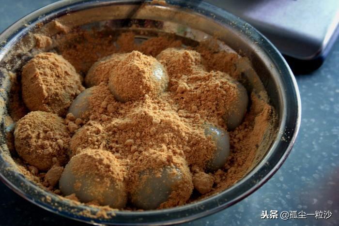 麻糍用糯米浸水沥干,蒸熟,放在石臼内捣粘,这个是很费力气的,一般由家中爸爸来执行这个任务,妈妈呢则在旁边粘点水,翻一下。弄好了,把它放在桌子上,压平,外面凃上松花,切成长条,铺上芝麻和糖的馅料,将另一头糍盖上压服,切成菱形,再放镬里烙熟装盘,就可以吃了。