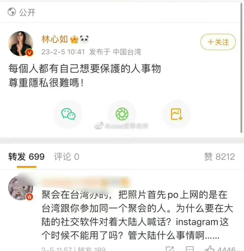 有网友发文爆料,说聚会是在台湾办得,把照片放上网的也是跟她参加同一个聚会的人,可是林心如却在内地的社交平台上对大陆人喊话,这张照片是在台湾聚会时拍的,并质疑她为何不在INS谴责擅自发布照片的人,并表示这件事情关我们大陆人什么事,别什么屎盆子都扣在我们大陆人头上。