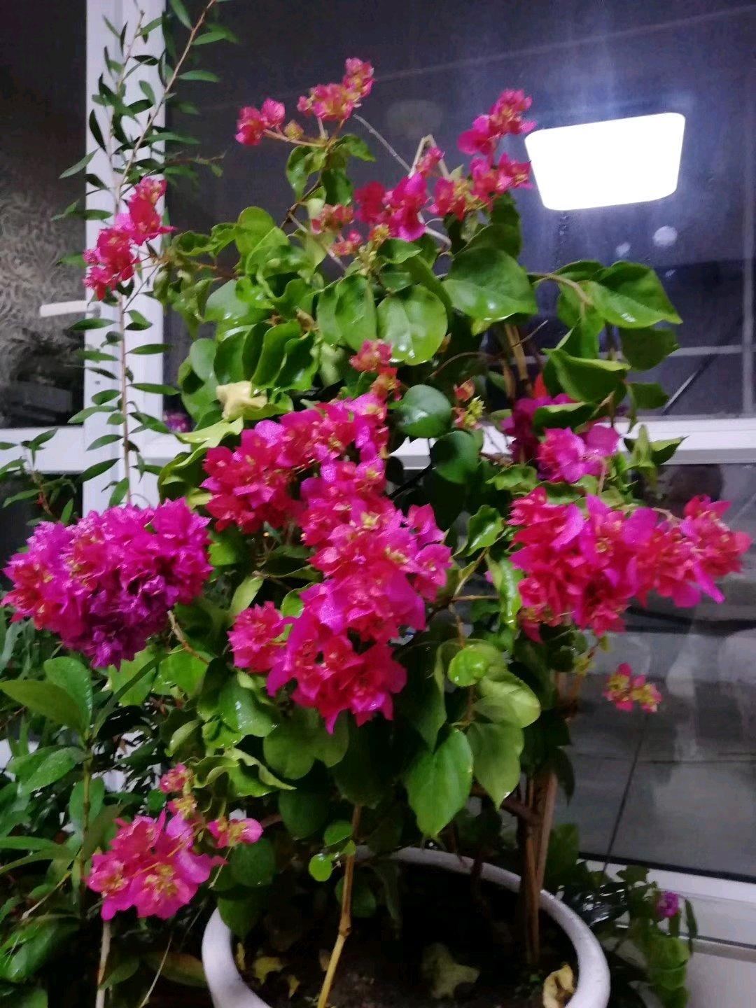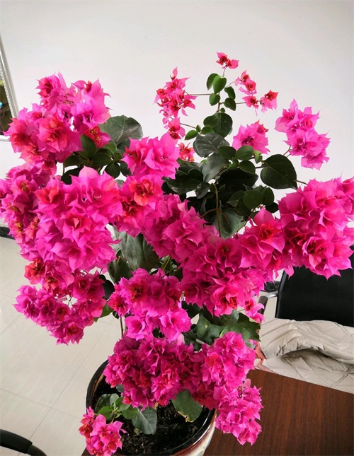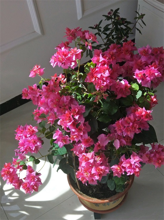 当然,要想养出爆盆的状态,有几个养护技巧要做好。一是光照时间要充足,三角梅是喜光喜阳植物,只有多晒太阳,植株才会长势旺盛,也才会孕育更多花苞;二是养分要跟上,穷养虽然也会开花,但是只会零星地开,经常给点含有磷钾的复合肥,薄肥勤施,才会花开不断、花量爆盆;三是适当地修剪,主要是生长期打顶、促分枝,还有开完花后小修剪一次,能促使开更多花、复花也更快。