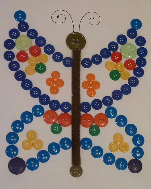 纽扣画——不用画笔、不用颜料,只需将一堆色彩鲜艳的纽扣,拼摆成你喜欢的图案,用胶水固定就OK啦!蝴蝶、房屋、海马……你想到什么就可以摆什么。