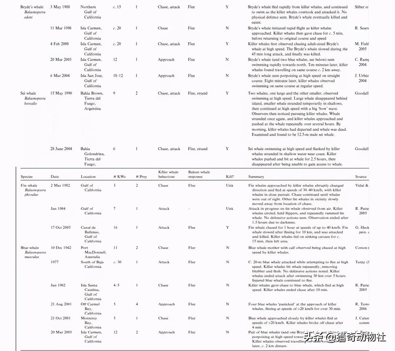 在这些目击案例中,大多数是10头以上的虎鲸围攻1-2头蓝鲸(2头蓝鲸的情况是成年雌性带着幼体),而被击杀的蓝鲸体长平均都在20米以下。(下图为虎鲸捕杀蓝鲸的目击记载)