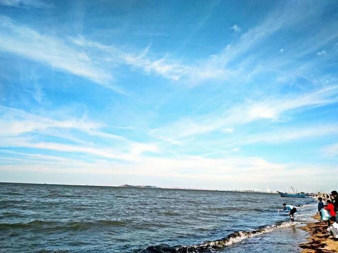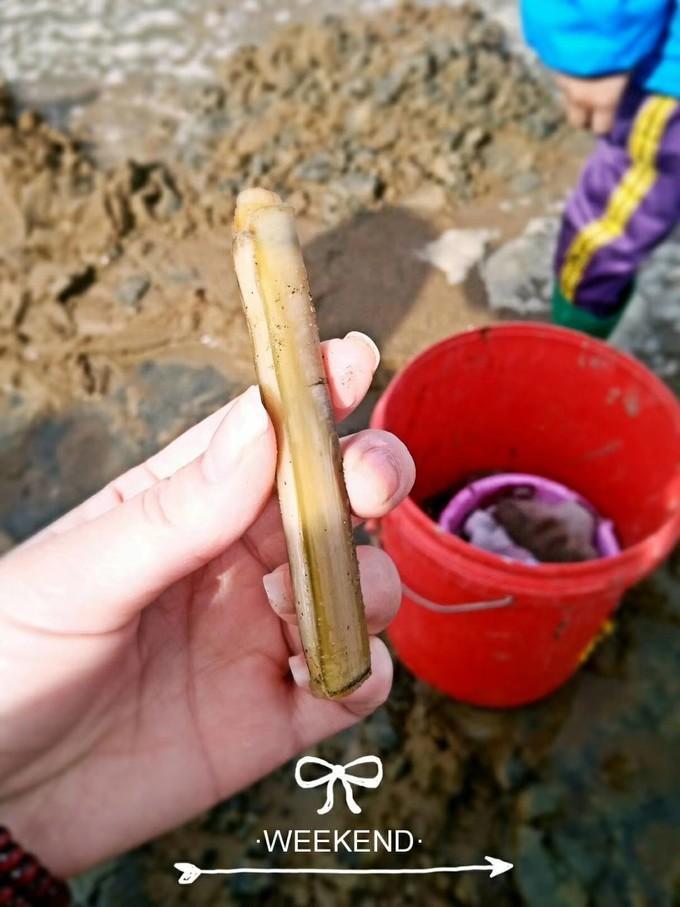 沙滩上会看到很多在挖蛏子的人,去学习一下,自己挖挖试试,我当时买的工具太小的,所以只能挖挖小螃蟹啥的了……有经验的人都是用锹的。一锹下去,有一个小洞,撒上盐,等着,滋溜一下就钻出来了,要立马抓住。