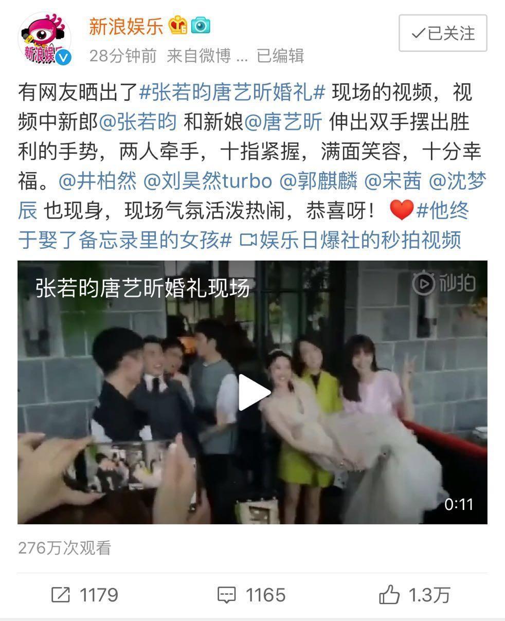 紧接着有网友晒出了张若昀唐艺昕婚礼现场的视频,现场气氛十分活泼,伴郎伴娘团颜值惊人,的确是之前网络上传的井柏然、刘昊然、郭麒麟、宋茜、沈梦辰。
