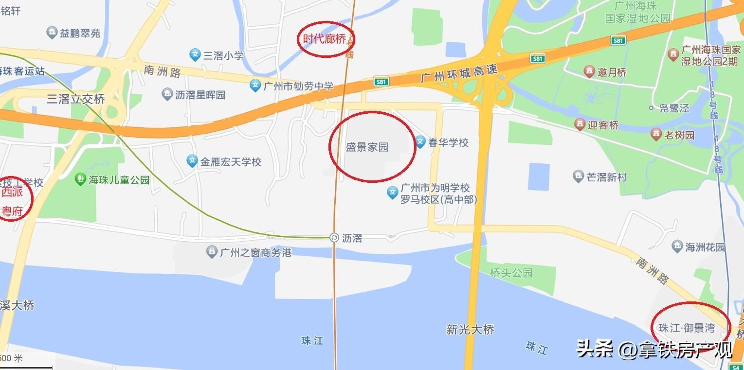 这个板块里不管是新盘还是二手都不多,新盘就是珠光旧改的海珠新城,以及拍地而来的西派粤府,还有一个才盘活的海珠湖景峰,二手主要是罗马家园、珠江御景湾、时代廊桥,另外星晖园是没有产权的,海洲花园是军产房,都不能交易。