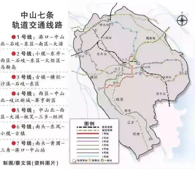 1号线:港口-中山北-石岐-东区-南区-大涌2号线:小榄-东升-西区-石岐-东区-火炬区-马鞍岛3号线:古镇-横栏-沙溪-石岐-东区4号线:西区-中山北-岐江新城-翠亨新区5号线:中山北-西区-大涌-板芙-三乡-坦洲6号线:南头-东凤-小榄-古镇7号线:南头-黄圃-三角-港口-中山站