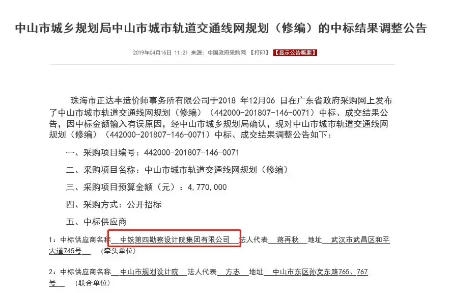 近日,中国政府采购网挂出中山市城乡规划局中山市城市轨道交通线网规划(修编)的中标结果调整公告,根据公示,中山市城市轨道交通线网规划(修编)的项目将由中铁第四勘察设计院集团有限公司作为第一供应商!