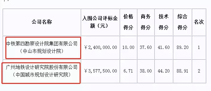 评标委员会按综合得分由高到低的排名顺序推荐第一名和第二名的投标人,中铁第四勘察设计院集团有限公司(中山市规划设计院)作为第一供应商,广州地铁设计研究院股份有限公司(中国城市规划设计研究院)是作为第二成交供应商。