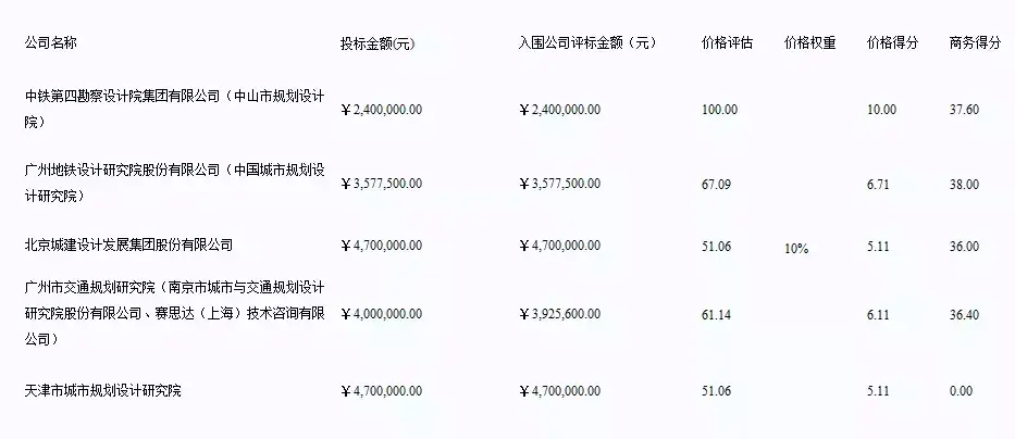 值得注意的是,一共有5家公司进行投标。分别为中铁第四勘察设计院集团有限公司(中山市规划设计院)、广州地铁设计研究院股份有限公司(中国城市规划设计研究院)、北京城建设计发展集团股份有限公司、广州市交通规划研究院(南京市城市与交通规划设计研究院股份有限公司、赛思达(上海)技术咨询有限公司)和天津市城市规划设计研究院。