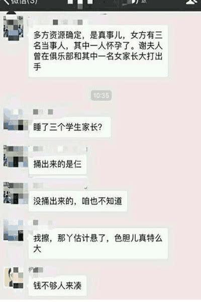 还有一张貌似知情人微信爆料的截屏,称谢朝阳妻子曾与一名女家长大打出手,“睡了三个家长”、“还有一个怀孕了”、“还说什么钱不够人来凑”。