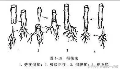 7、根接:用根作砧木进行枝接,叫根接。可以用劈接、切接、靠接等方法。根接常常在秋冬季节的室内进行,结合苗圃起苗收集砧木。