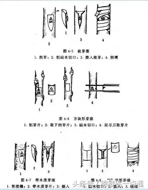 2、嵌芽接: 对于枝梢具有棱角或沟纹的树种,如板栗、枣等,或其他植物材料砧木和接穗均不离皮时,可用嵌芽接法。