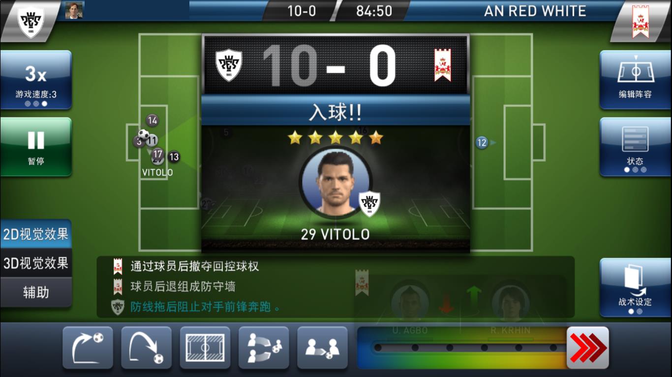 这是小编前期时的单场最高(随着后期对手的增强,免费玩家球队总成到700多就再也上不去了,10:0的情况以后应该也不会有了)