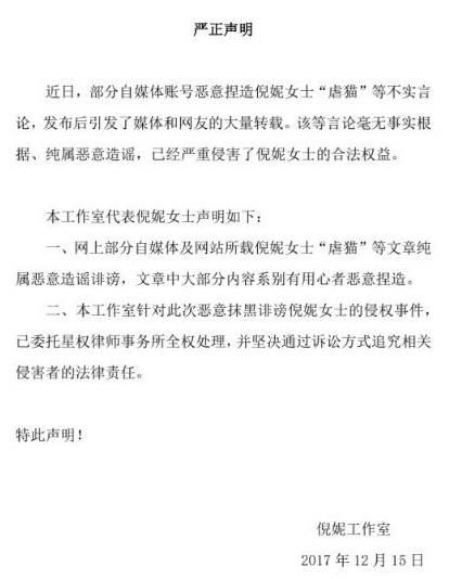 对此,今日,倪妮工作室发出声明:近日有部分自媒体账号恶意捏造倪妮女士“虐猫”等不实言论,引发了媒体和网友的大量转载。该等言论毫无事实根据、纯属恶意捏造,已经严重侵害了倪妮女士的合法权益。会坚持以诉讼方式追究法律责任。
