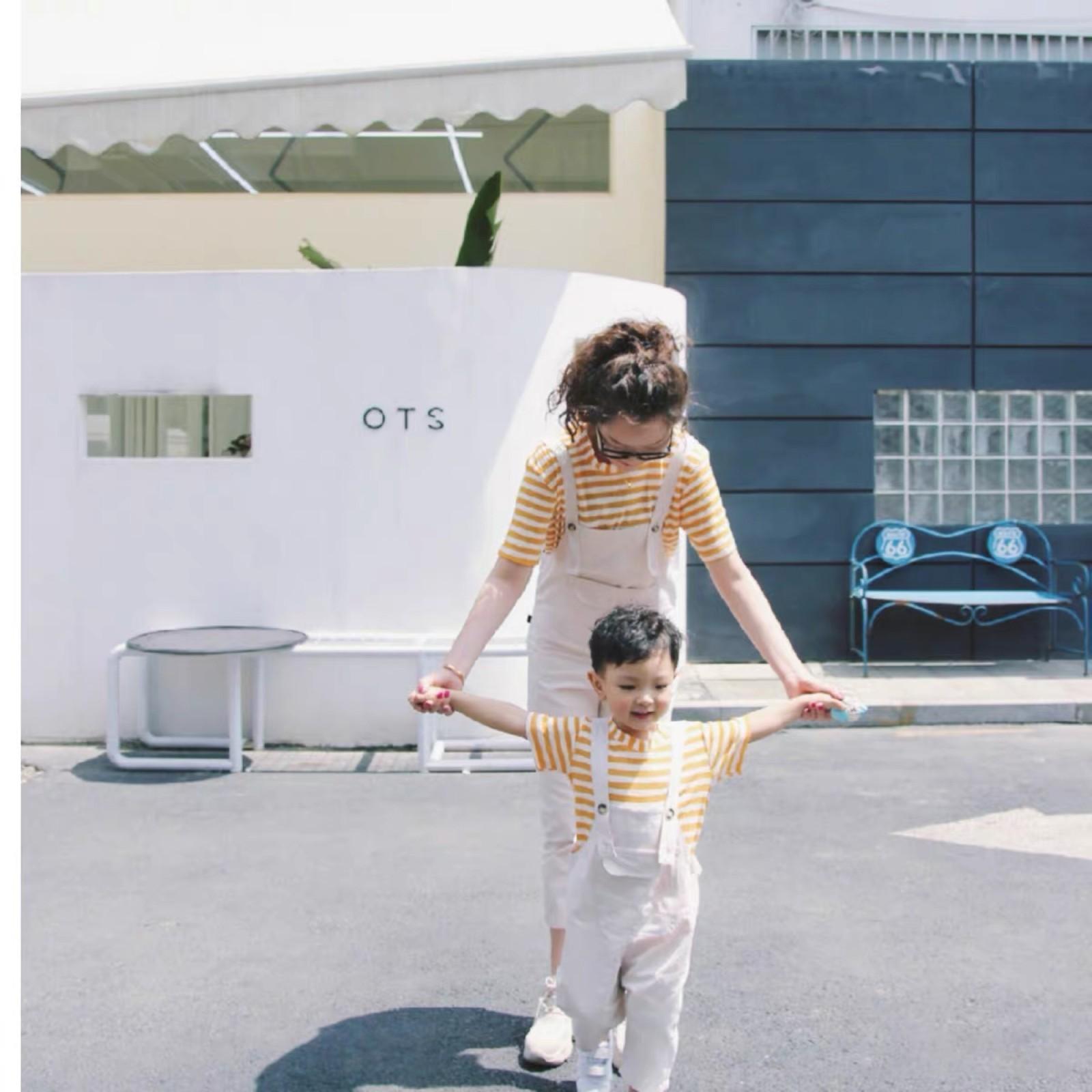 比如上图中,妈妈和儿子身上都有条纹元素,设计感很足的条纹让人一眼就关注到,时尚感满满,款式上也是基础又好看,搭配起来很有夏日气息。